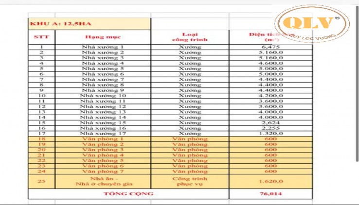 Diện tích từng nhà xưởng